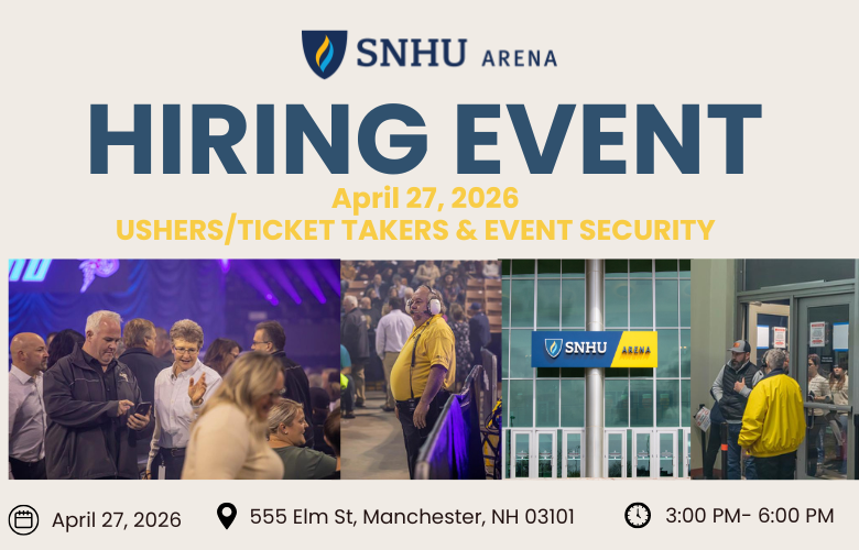 Join us on April 27 at the SNHU Arena for a Hiring Event! We’re looking for enthusiastic individuals interested in Usher/Ticket Taker and Event Security positions.